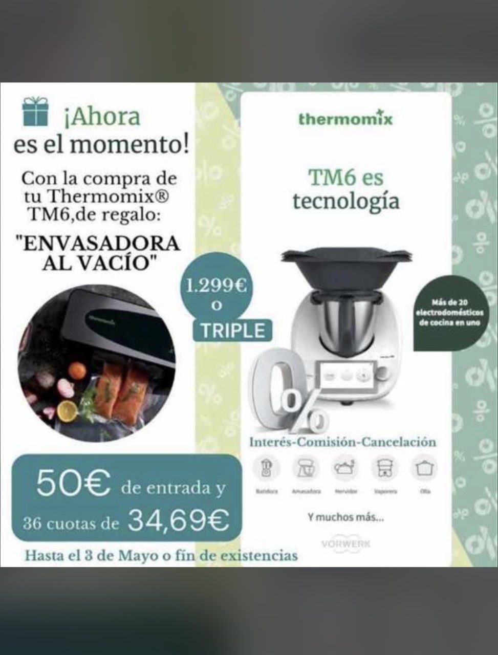 Ahora para una fecha tan especial por la compra de thermomix te llevarás otro fantástico regalo como es la ENVASADORA AL VACIO de Thermomix sin pagar un euro más, todo por 1299€., y si la quieres financiar este es tu momento, porque NO vas a pagar intereses . TIENES EL TRIPLE 0 : 0% de interés, 0% comisión de apertura y 0€ de gastos, pero sólo hasta el día 3 de Mayo. Así que no esperes más y no te quedes sin esta gran oportunidad.
